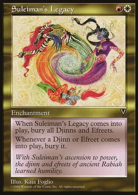 When Suleiman’s Legacy comes into play, bury all Djinns and Efreets.Whenever a Djinn or Efreet comes into play, bury it.