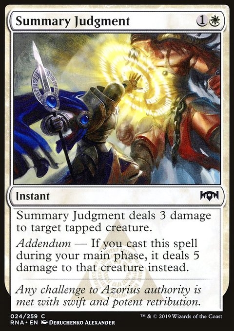 Summary Judgment deals 3 damage to target tapped creature. Addendum — If you cast this spell during your main phase, it deals 5 damage instead.
