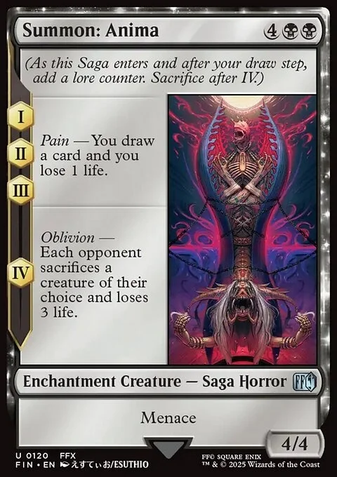(As this Saga enters and after your draw step, add a lore counter. Sacrifice after IV.) I, II, III — Pain — You draw a card and you lose 1 life. IV — Oblivion — Each opponent sacrifices a creature of their choice and loses 3 life. Menace