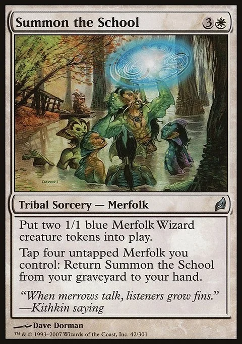Create two 1/1 blue Merfolk Wizard creature tokens. Tap four untapped Merfolk you control: Return this card from your graveyard to your hand.