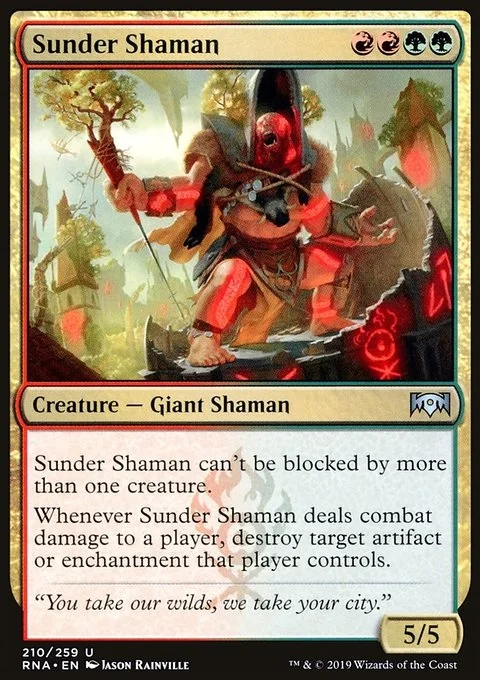 Sunder Shaman can't be blocked by more than one creature. Whenever Sunder Shaman deals combat damage to a player, destroy target artifact or enchantment that player controls.