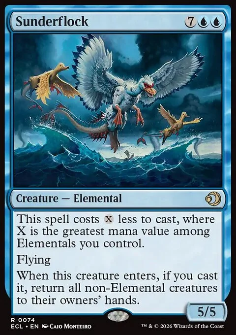 This spell costs {X} less to cast, where X is the greatest mana value among Elementals you control. Flying When this creature enters, if you cast it, return all non-Elemental creatures to their owners' hands.