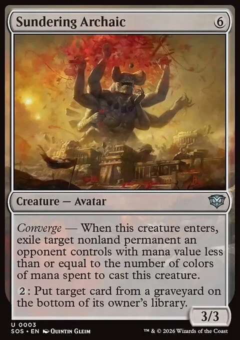 Converge — When this creature enters, exile target nonland permanent an opponent controls with mana value less than or equal to the number of colors of mana spent to cast this creature. {2}: Put target card from a graveyard on the bottom of its owner's library.