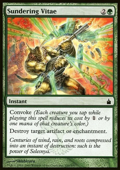 Convoke (Your creatures can help cast this spell. Each creature you tap while casting this spell pays for {1} or one mana of that creature's color.) Destroy target artifact or enchantment.