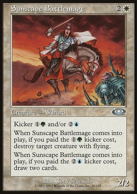 When Sunscape Battlemage comes into play, if you paid the 2U kicker cost, draw two cards.