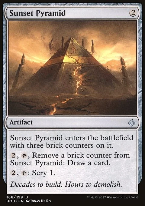 Sunset Pyramid enters the battlefield with three brick counters on it. {2}, {T}, Remove a brick counter from Sunset Pyramid: Draw a card. {2}, {T}: Scry 1.