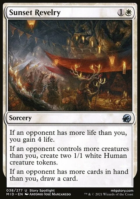 If an opponent has more life than you, you gain 4 life. If an opponent controls more creatures than you, create two 1/1 white Human creature tokens. If an opponent has more cards in hand than you, draw a card.