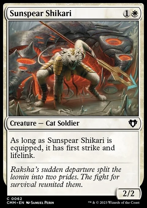 As long as this creature is equipped, it has first strike and lifelink. (It deals combat damage before creatures without first strike. Damage dealt by it also causes you to gain that much life.)