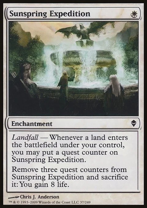 Landfall — Whenever a land enters the battlefield under your control, you may put a quest counter on Sunspring Expedition. Remove three quest counters from Sunspring Expedition and sacrifice it: You gain 8 life.