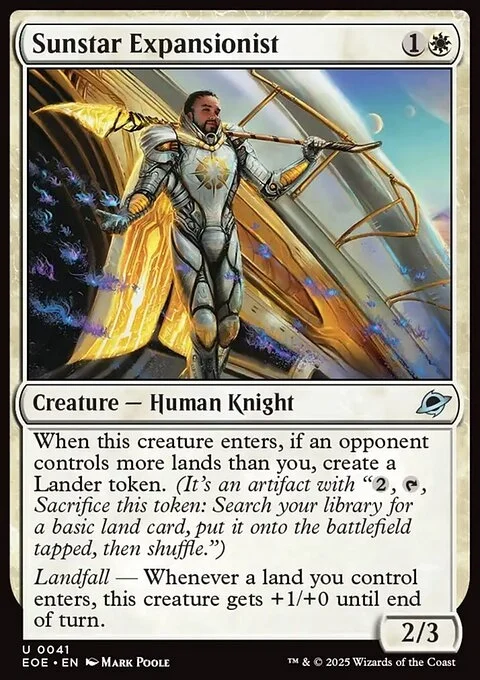 When this creature enters, if an opponent controls more lands than you, create a Lander token. (It's an artifact with "{2}, {T}, Sacrifice this token: Search your library for a basic land card, put it onto the battlefield tapped, then shuffle.")
