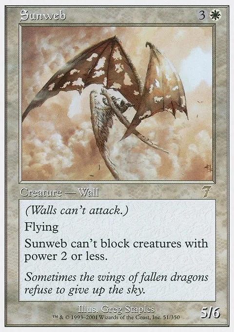 Defender (This creature can't attack.) Flying Sunweb can't block creatures with power 2 or less.