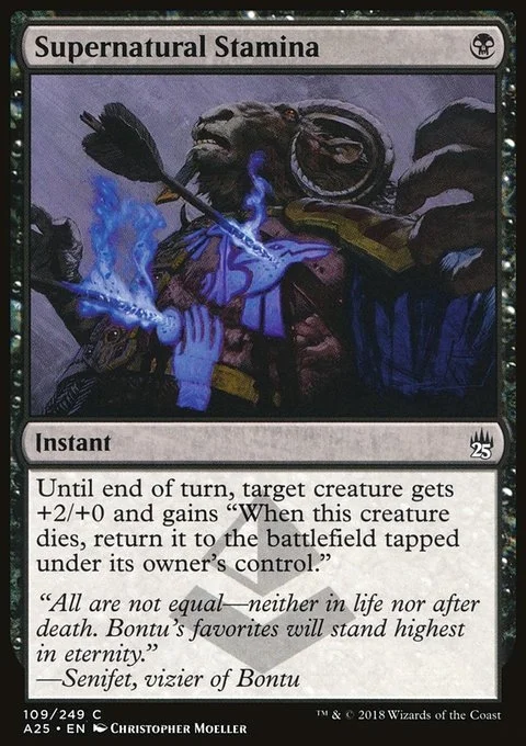 Until end of turn, target creature gets +2/+0 and gains "When this creature dies, return it to the battlefield tapped under its owner's control."