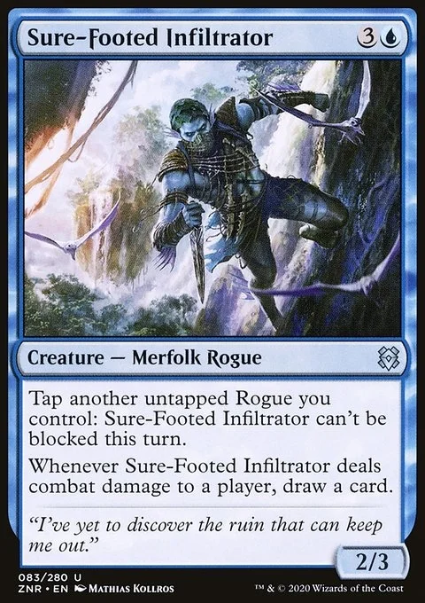 Tap another untapped Rogue you control: Sure-Footed Infiltrator can't be blocked this turn. Whenever Sure-Footed Infiltrator deals combat damage to a player, draw a card.