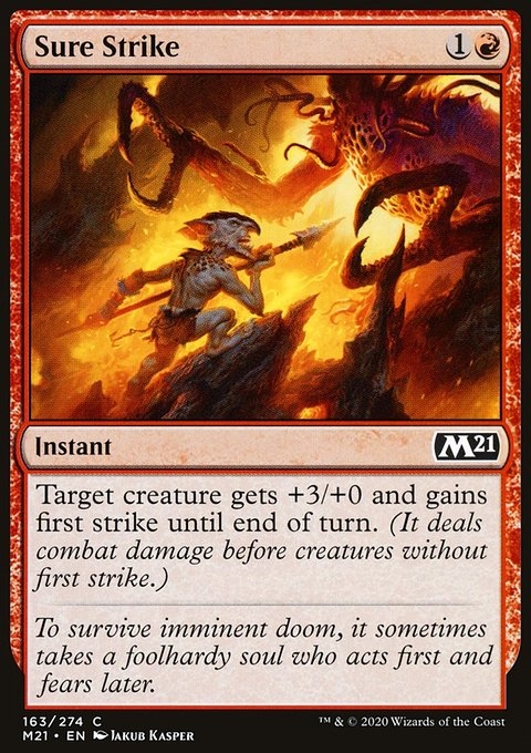 Target creature gets +3/+0 and gains first strike until end of turn. (It deals combat damage before creatures without first strike.)