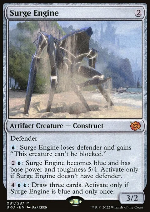 Defender {U}: This creature loses defender and gains "This creature can't be blocked." {2}{U}: This creature becomes blue and has base power and toughness 5/4. Activate only if this creature doesn't have defender. {4}{U}{U}: Draw three cards. Activate only if this creature is blue and only once.