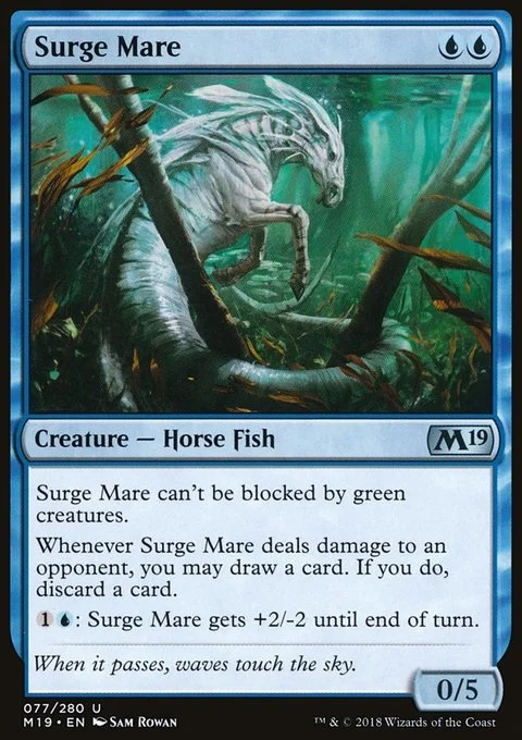 Surge Mare can't be blocked by green creatures. Whenever Surge Mare deals damage to an opponent, you may draw a card. If you do, discard a card. {1}{U}: Surge Mare gets +2/-2 until end of turn.