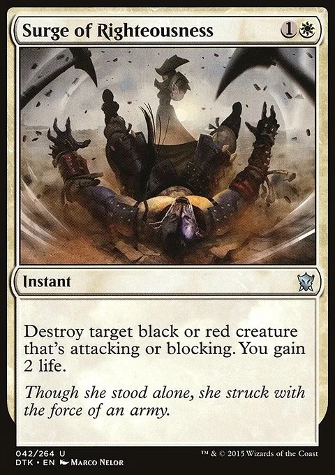 Destroy target black or red creature that's attacking or blocking. You gain 2 life.