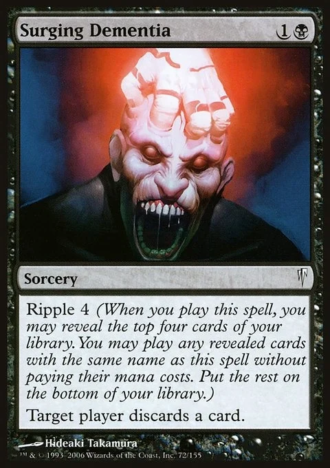 Ripple 4 (When you cast this spell, you may reveal the top four cards of your library. You may cast spells with the same name as this spell from among those cards without paying their mana costs. Put the rest on the bottom of your library.) Target player discards a card.