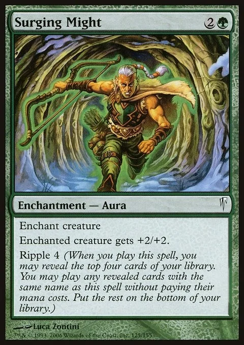 Enchant creature Enchanted creature gets +2/+2. Ripple 4 (When you cast this spell, you may reveal the top four cards of your library. You may cast spells with the same name as this spell from among those cards without paying their mana costs. Put the rest on the bottom of your library.)