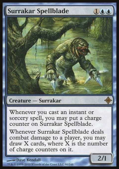 Whenever you cast an instant or sorcery spell, you may put a charge counter on Surrakar Spellblade. Whenever Surrakar Spellblade deals combat damage to a player, you may draw X cards, where X is the number of charge counters on it.
