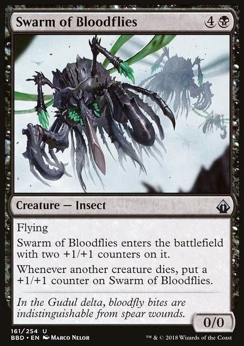 Flying Swarm of Bloodflies enters the battlefield with two +1/+1 counters on it. Whenever another creature dies, put a +1/+1 counter on Swarm of Bloodflies.