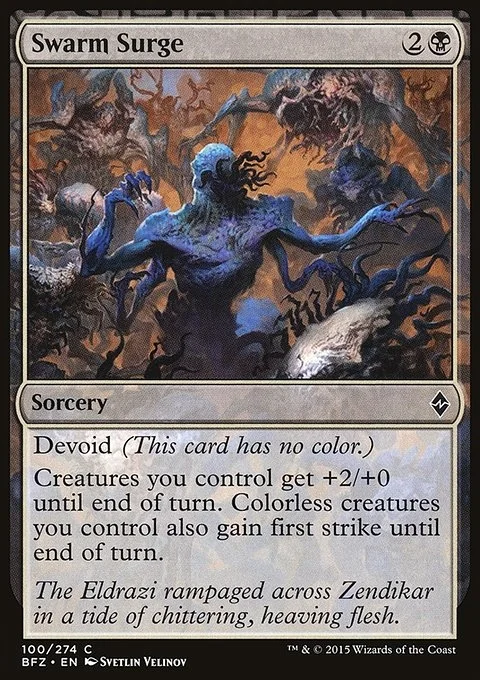 Devoid (This card has no color.) Creatures you control get +2/+0 until end of turn. Colorless creatures you control also gain first strike until end of turn.