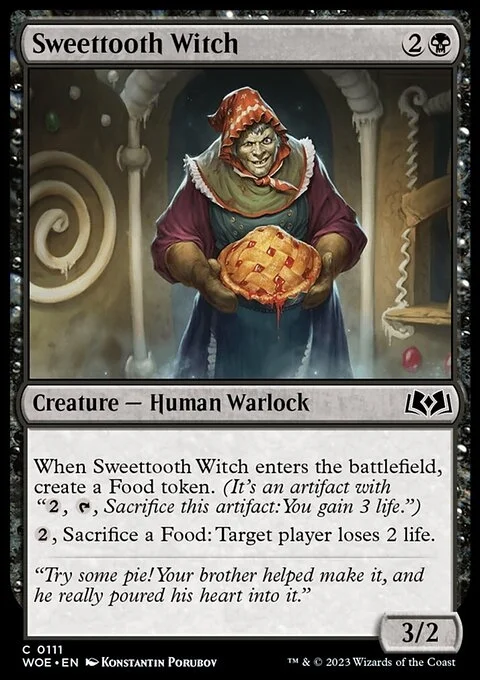 When this creature enters, create a Food token. (It's an artifact with "{2}, {T}, Sacrifice this token: You gain 3 life.") {2}, Sacrifice a Food: Target player loses 2 life.