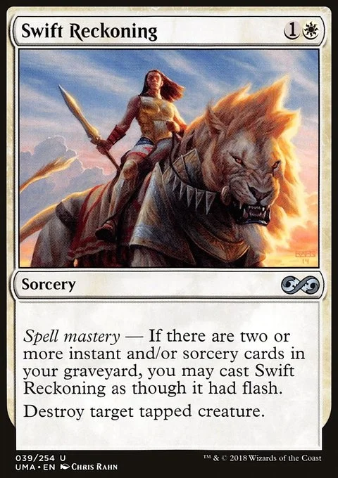 Spell mastery — If there are two or more instant and/or sorcery cards in your graveyard, you may cast Swift Reckoning as though it had flash. (You may cast it any time you could cast an instant.) Destroy target tapped creature.