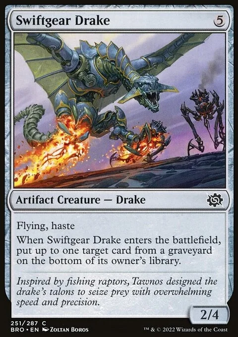 Flying, haste When this creature enters, put up to one target card from a graveyard on the bottom of its owner's library.