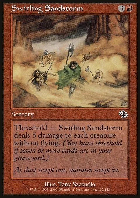 Threshold — Swirling Sandstorm deals 5 damage to each creature without flying if seven or more cards are in your graveyard.