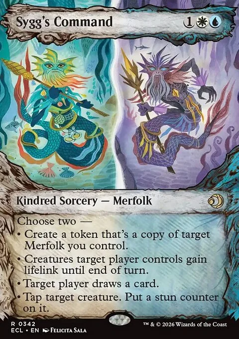 Choose two — • Create a token that's a copy of target Merfolk you control. • Creatures target player controls gain lifelink until end of turn. • Target player draws a card. • Tap target creature. Put a stun counter on it.