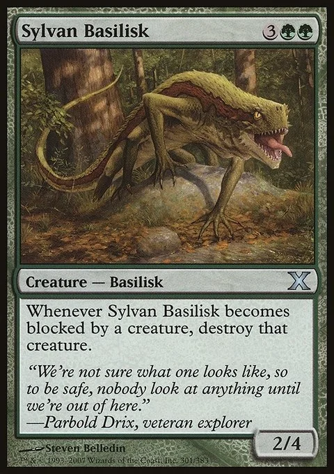 Whenever Sylvan Basilisk becomes blocked by a creature, destroy that creature.