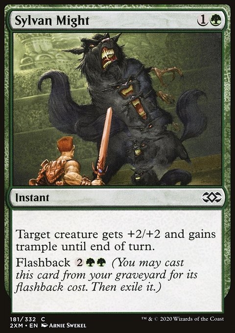 Target creature gets +2/+2 and gains trample until end of turn. Flashback {2}{G}{G} (You may cast this card from your graveyard for its flashback cost. Then exile it.)