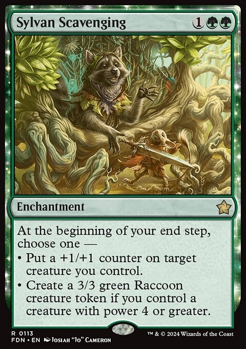 At the beginning of your end step, choose one — • Put a +1/+1 counter on target creature you control. • Create a 3/3 green Raccoon creature token if you control a creature with power 4 or greater.