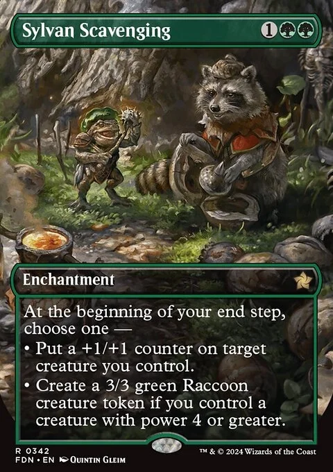 At the beginning of your end step, choose one — • Put a +1/+1 counter on target creature you control. • Create a 3/3 green Raccoon creature token if you control a creature with power 4 or greater.