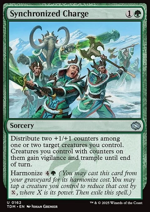 Distribute two +1/+1 counters among one or two target creatures you control. Creatures you control with counters on them gain vigilance and trample until end of turn. Harmonize {4}{G} (You may cast this card from your graveyard for its harmonize cost. You may tap a creature you control to reduce that cost by {X}, where X is its power. Then exile this spell.)