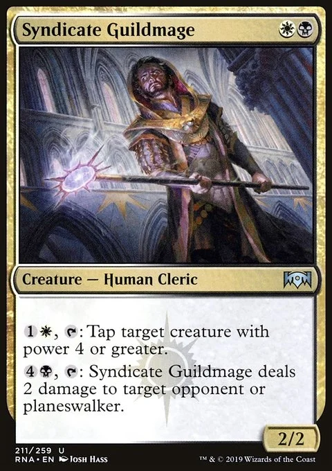 {1}{W}, {T}: Tap target creature with power 4 or greater. {4}{B}, {T}: Syndicate Guildmage deals 2 damage to target opponent or planeswalker.