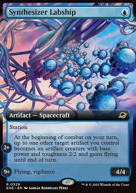 Station (Tap another creature you control: Put charge counters equal to its power on this Spacecraft. Station only as a sorcery. It's an artifact creature at 9+.) STATION 2+ At the beginning of combat on your turn, up to one other target artifact you control becomes an artifact creature with base power and toughness 2/2 and gains flying until end of turn. STATION 9+ Flying, vigilance