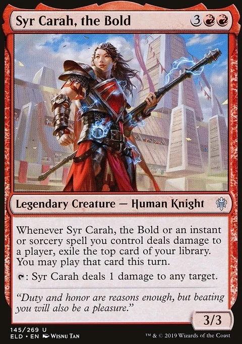Whenever Syr Carah, the Bold or an instant or sorcery spell you control deals damage to a player, exile the top card of your library. You may play that card this turn. {T}: Syr Carah deals 1 damage to any target.