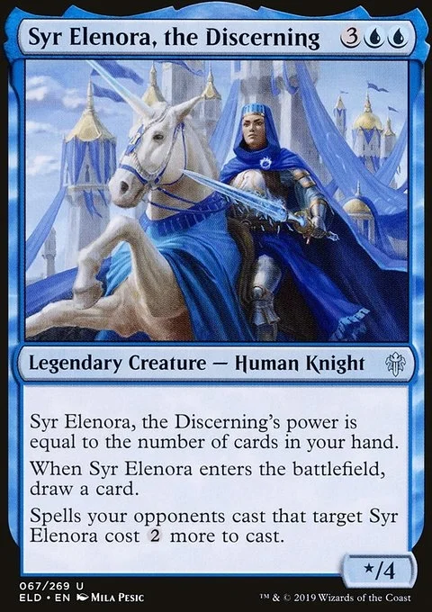 Syr Elenora, the Discerning's power is equal to the number of cards in your hand. When Syr Elenora enters the battlefield, draw a card. Spells your opponents cast that target Syr Elenora cost {2} more to cast.