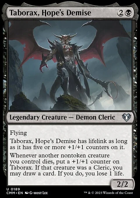 Whenever another nontoken creature you control dies, put a +1/+1 counter on Taborax. If that creature was a Cleric, you may draw a card. If you do, you lose 1 life.