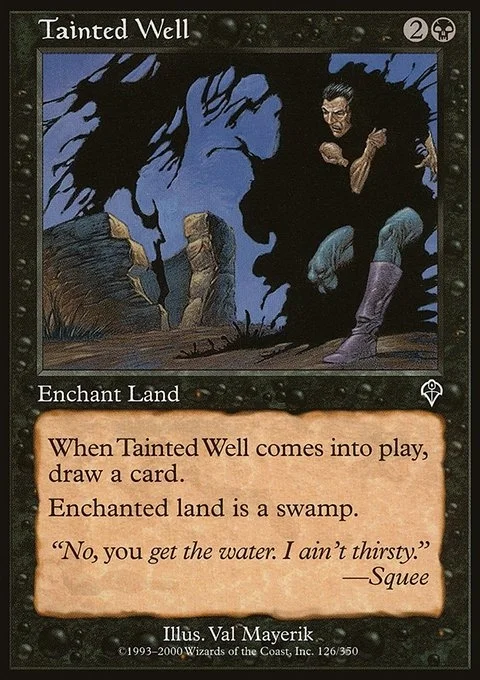 Enchant land When Tainted Well enters the battlefield, draw a card. Enchanted land is a Swamp.