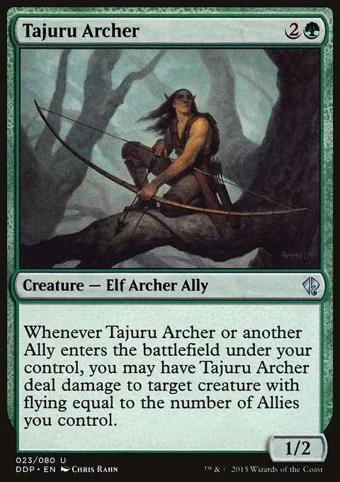 Whenever Tajuru Archer or another Ally you control enters, you may have Tajuru Archer deal damage to target creature with flying equal to the number of Allies you control.