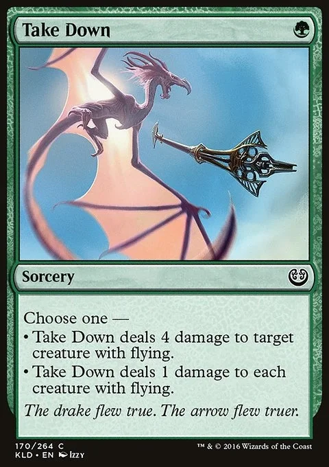 Choose one — • Take Down deals 4 damage to target creature with flying. • Take Down deals 1 damage to each creature with flying.