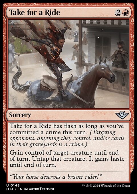 Take for a Ride has flash as long as you've committed a crime this turn. (Targeting opponents, anything they control, and/or cards in their graveyards is a crime.)