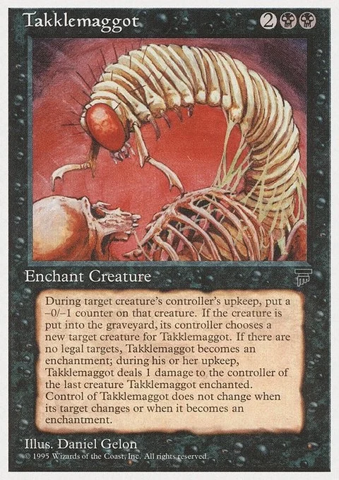 During target creature’s controller’s upkeep, put a -0/-1 counter on that creature. If the creature is put into the graveyard, its controller chooses a new target creature for Takklemaggot. If there are no legal targets, Takklemaggot becomes an enchantment; during his or her upkeep, Takklemaggot deals 1 damage to the controller of the last creature Takklemaggot enchanted. Control of Takklemaggot does not change when its target changes or when it becomes an enchantment.