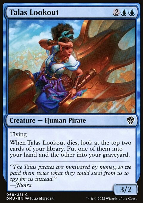 Flying When this creature dies, look at the top two cards of your library. Put one of them into your hand and the other into your graveyard.