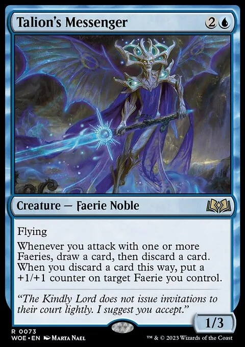 Flying Whenever you attack with one or more Faeries, draw a card, then discard a card. When you discard a card this way, put a +1/+1 counter on target Faerie you control.