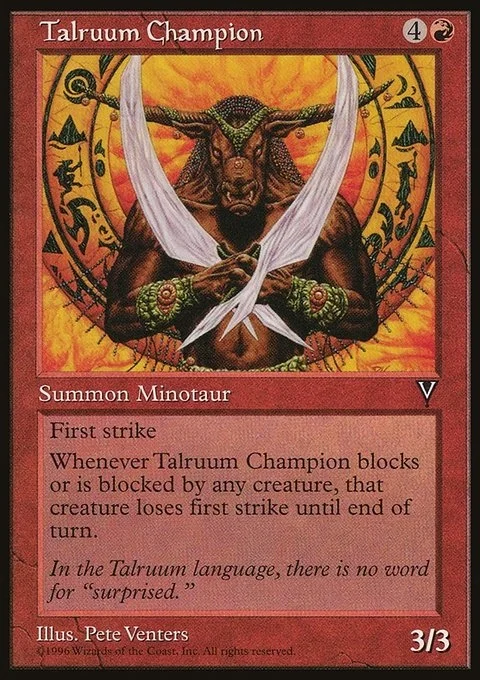 First strike Whenever Talruum Champion blocks or becomes blocked by a creature, that creature loses first strike until end of turn.