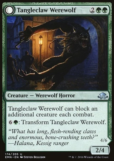 Tangleclaw Werewolf Tangleclaw Werewolf can block an additional creature each combat. {6}{G}: Transform Tangleclaw Werewolf. Fibrous Entangler Vigilance Fibrous Entangler must be blocked if able. Fibrous Entangler can block an additional creature each combat.